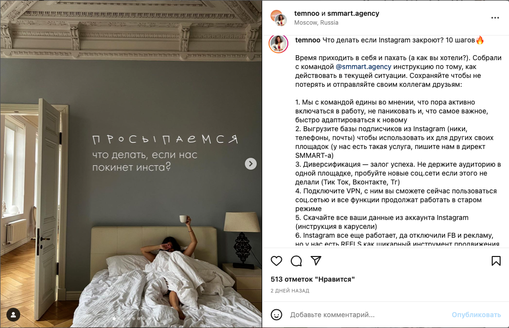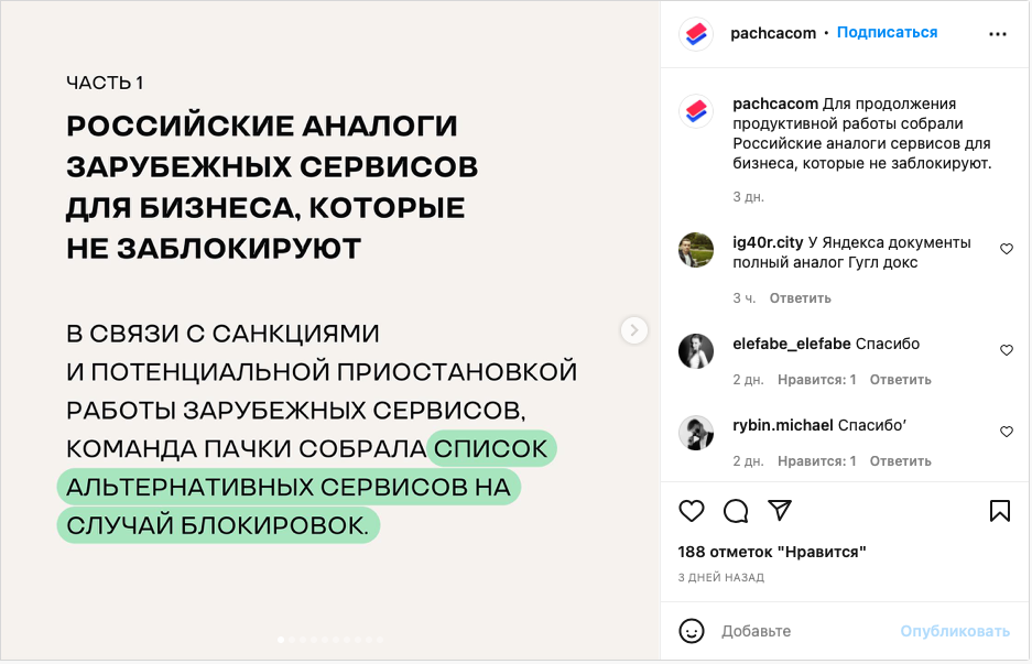 Тем не менее, Инстаграм также остается активной площадкой, которая даже без рекламы будет приносить продажи бизнесу за счет органики и рекламы у блогеров. Во всяком случае на 5 марта 2022, поэтому от Инсты пока отказываться никто не собирается, просто прорабатываем план «Б» и надеемся на светлое будущее.